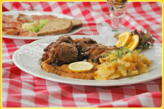 | Kalte Platten z.B. Hausmacher aus eigener Produktion mit Salaten und Dips | warme Speisen z.B. gemschtes Bratenfleisch, verschiedene Saucen mit Salaten und leckeren Nachspeisen. |